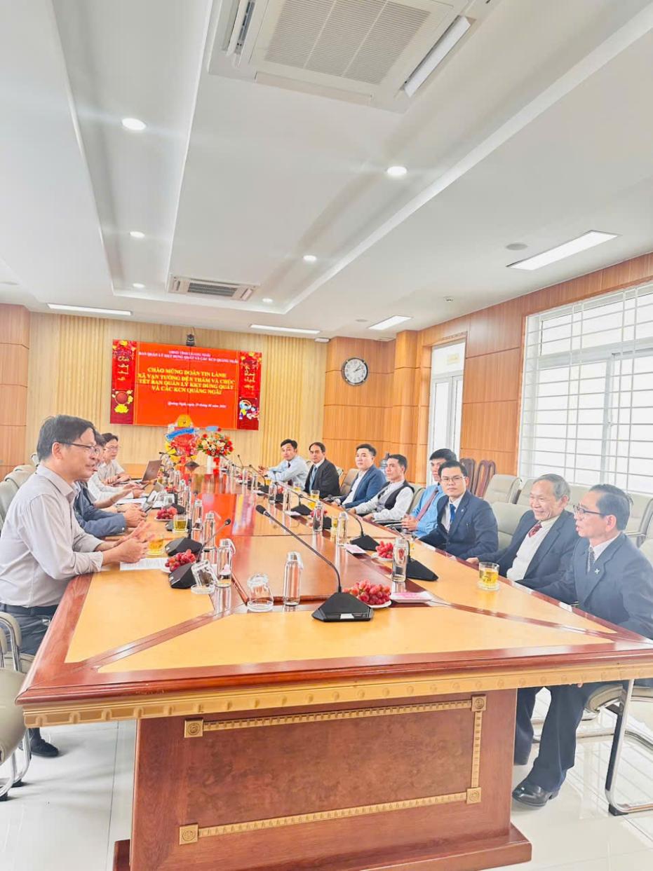 Chiều ngày 29/01/2026, tại trụ sở Ban Quản lý Khu kinh tế Dung Quất và các Khu công nghiệp Quảng Ngãi, Ban Quản lý đã tổ chức tiếp và làm việc với Đoàn Tin lành xã Vạn Tường (gồm Hội thánh Phước Thiện, Hội thánh An Cường, Hội thánh Lệ Thủy) đến thăm, chúc mừng nhân kỷ niệm 96 năm Ngày thành lập Đảng Cộng sản Việt Nam, chúc mừng thành công của Đại hội đại biểu toàn quốc lần thứ XIV của Đảng và chúc Tết Ban Quản lý.