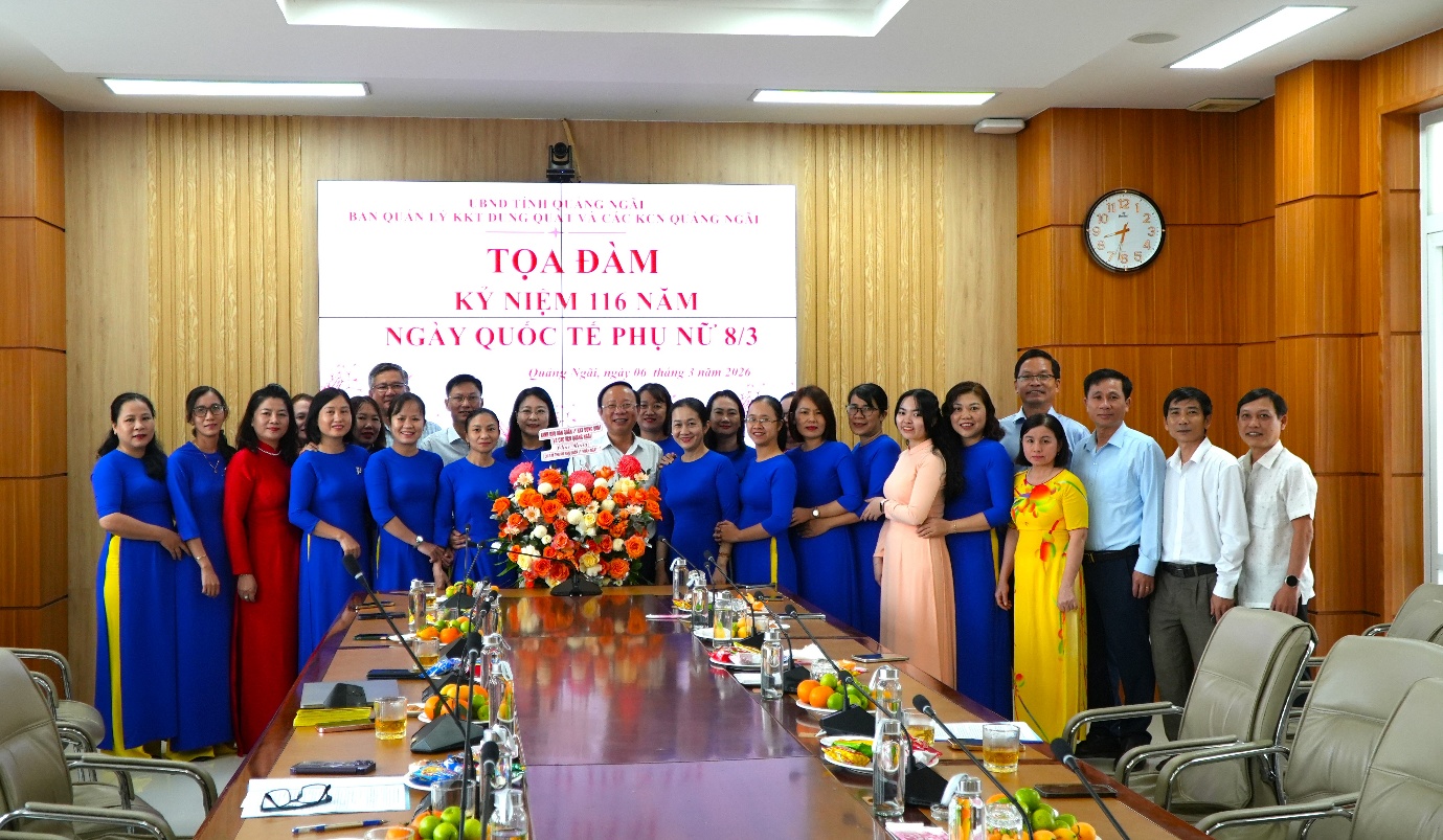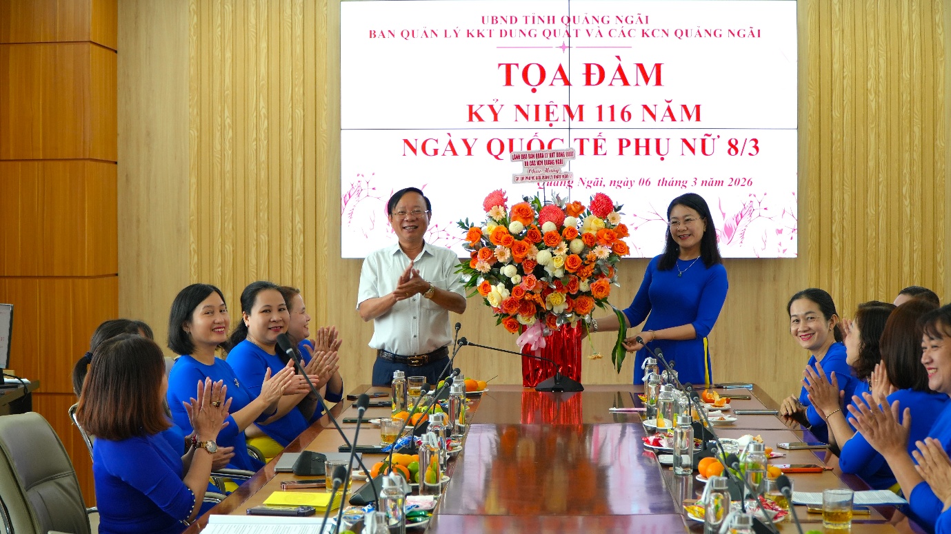Nhân kỷ niệm 116 năm Ngày Quốc tế Phụ nữ (8/3/1910 – 8/3/2026), Ban Quản lý KKT Dung Quất và các Khu công nghiệp Quảng Ngãi đã tổ chức Tọa đàm kỷ niệm Ngày Quốc tế Phụ nữ 8/3 nhằm tôn vinh vai trò, đóng góp của nữ cán bộ, công chức, viên chức và người lao động trong cơ quan.