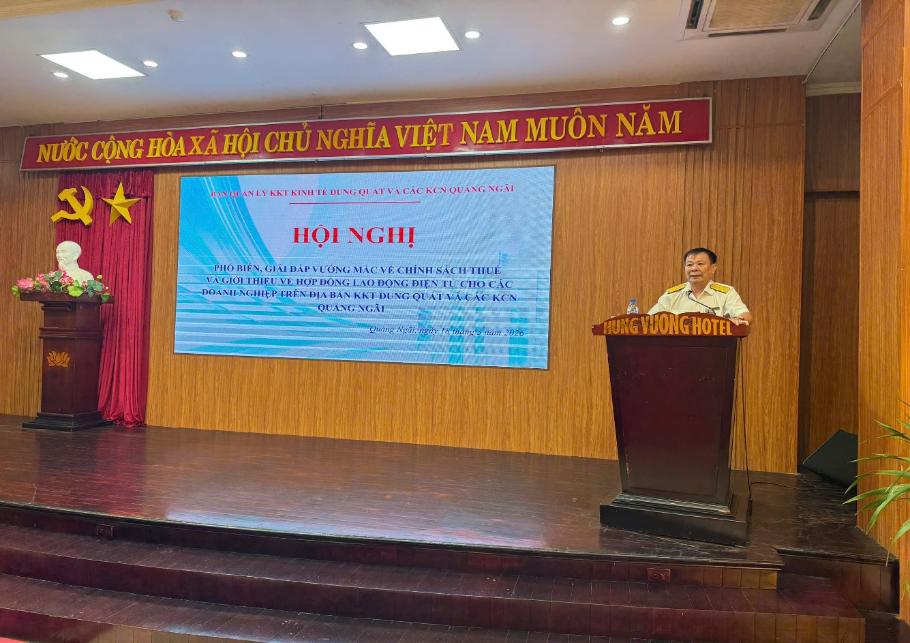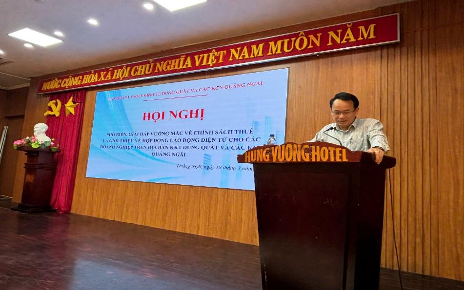 Sáng ngày 18/03/2026, tại Khách sạn Hùng Vương (TP. Quảng Ngãi), Ban Quản lý KKT Dung Quất và các KCN tỉnh Quảng Ngãi chủ trì, phối hợp với Thuế tỉnh Quảng Ngãi, Công ty CP MISA, Viettel tỉnh Quảng Ngãi tổ chức "Hội nghị phổ biến, giải đáp vướng mắc về chính sách thuế cho các doanh nghiệp trên địa bàn KKT Dung Quất và các KCN Quảng Ngãi".