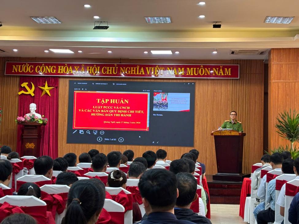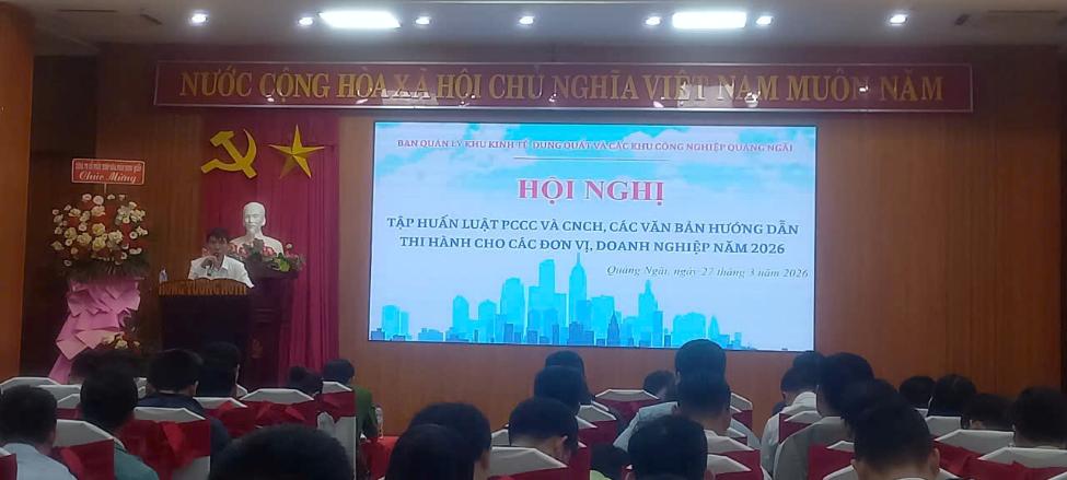 Sáng ngày 27/3/2026, tại Khách sạn Hùng Vương (Phường Cẩm Thành), Ban Quản lý KKT Dung Quất và các KCN tỉnh Quảng Ngãi đã tổ chức Hội nghị tập huấn các điểm mới của Luật Phòng cháy, chữa cháy và cứu nạn, cứu hộ, các văn bản hướng dẫn thi hành cho các đơn vị, doanh nghiệp năm 2026.