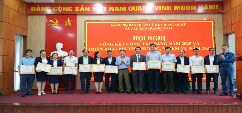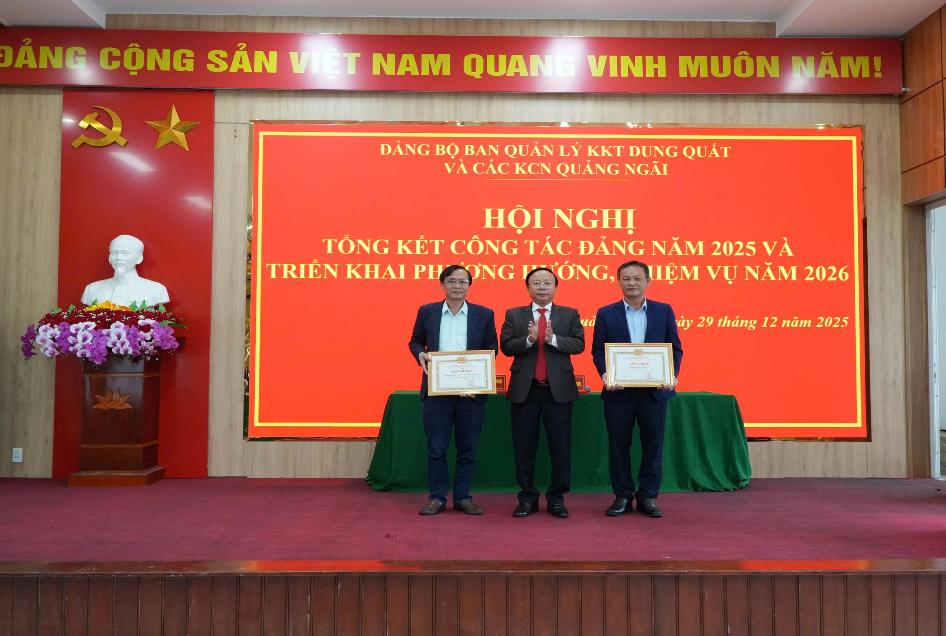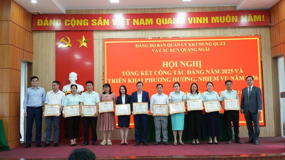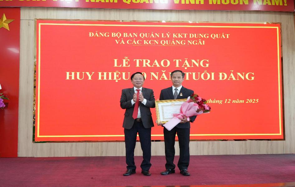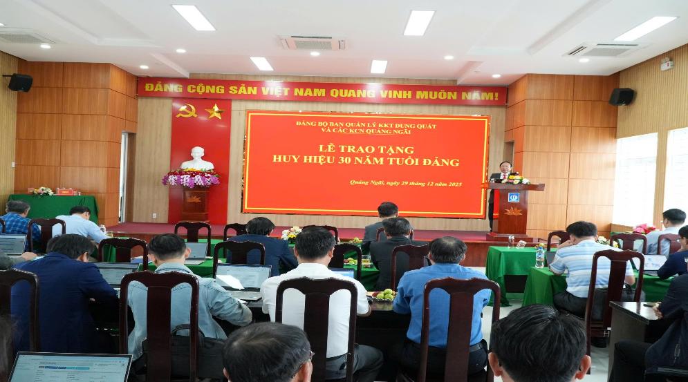 Thực hiện chương trình công tác năm 2025; ngày 29/12/2025, Đảng ủy Ban Quản lý KKT Dung Quất và các KCN Quảng Ngãi đã long trọng tổ chức Hội nghị tổng kết công tác xây dựng Đảng năm 2025, triển khai phương hướng, nhiệm vụ năm 2026 và Lễ trao tặng Huy hiệu 30 năm tuổi Đảng cho đảng viên.